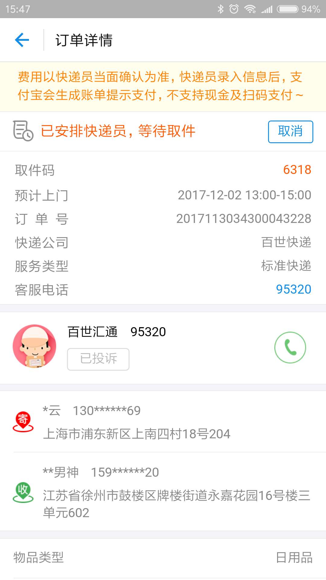 預(yù)約1點(diǎn)-3點(diǎn)上門取件,一直沒(méi)有來(lái)取件,聯(lián)系客服說(shuō)延遲,讓我打站點(diǎn)電話,打了要么沒(méi)有人接聽(tīng)要么就是通話中,再次聯(lián)系客服,說(shuō)沒(méi)有找到我的訂單!
