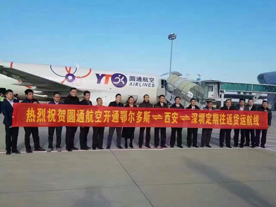 2016年11月1日,圓通速遞新增鄂爾多斯-西安-深圳往返全貨機(jī)航線(xiàn)。改航線(xiàn)凌晨執(zhí)行(00:30起飛)西安-深圳-西安-鄂爾多斯(08:30落地)。