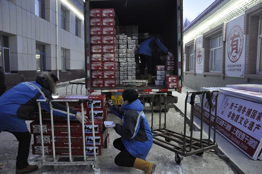 查干湖冬捕,即查干湖冬季冰雪漁獵,是一種極其傳統(tǒng)的漁業(yè)生產(chǎn)方式,始于史前、盛于遼金,延續(xù)至今千年未變,當(dāng)?shù)貪O民被稱為“最后的漁獵部落”。12月末到春節(jié)前是查干湖冬捕的黃金時間,漁民借助馬拉絞盤的力量在冰下行網(wǎng)捕魚,其盛大的場景每年都吸引著數(shù)萬國內(nèi)外游客前來觀看。2011年,中通吉林松原公司開通了查干湖承包區(qū),推出了“大美查干湖、中通鮮到家”的宣傳口號,并自行購置加厚紙箱、保溫箱等專業(yè)包裝材料,為寄遞客戶提供免費(fèi)包裝服務(wù)。如今,查干湖分部承包區(qū)日發(fā)件量500票以上,名列松原公司首位,也為查干湖魚的對外銷售打開了一條新通道。